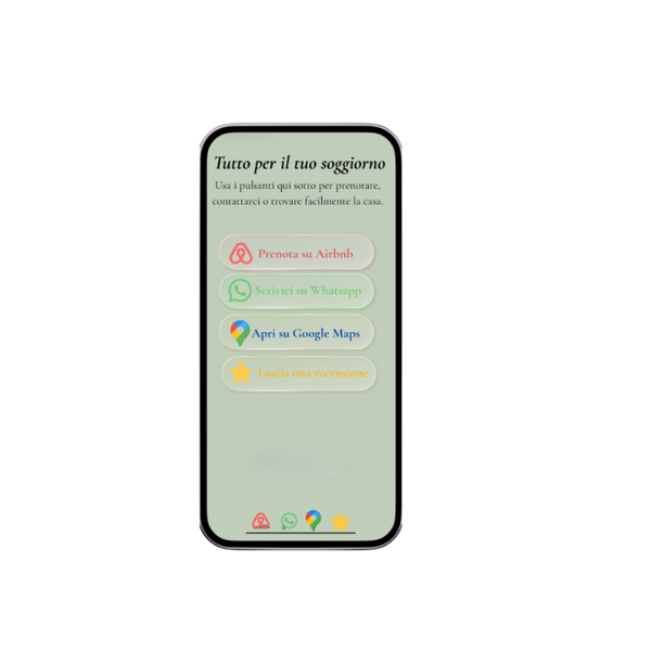 Gli ospiti potranno accedere facilmente dal loro smartphone a tutte le informazioni utili del soggiorno: prenotazione Airbnb, contatto WhatsApp, indicazioni Google Maps, recensioni e dettagli sulla casa vacanza. La guida può essere arricchita con consigli su ristoranti locali, attrazioni turistiche, spiagge, attività ed esperienze nei dintorni, aiutando gli ospiti a scoprire il territorio. Può essere condivisa tramite link oppure QR code stampabile, per un accesso immediato e sempre disponibile.